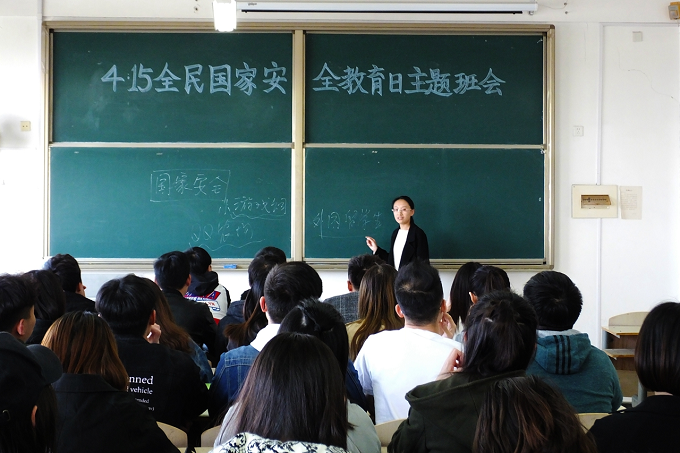 4月15日下午,4·15全民国家安全教育日主题班会在明水校区电教2507教室举办,辅导员老师石振玲担任主讲人,16级工商信管系各班班委和宿舍舍长到场参会,现场秩序井然。