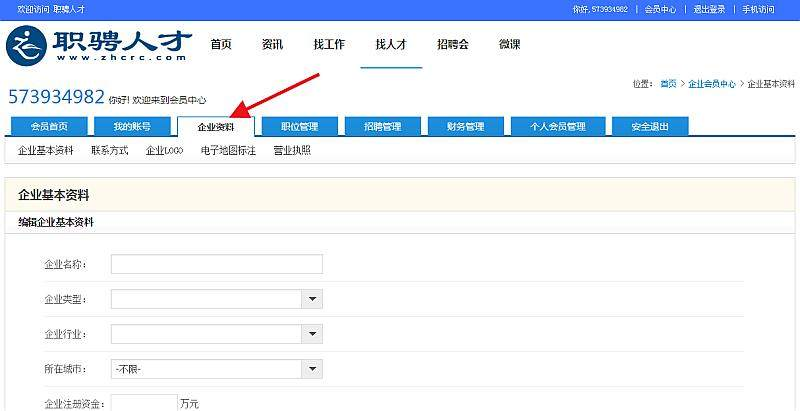 注册成功后,点击企业资料完善企业资料。