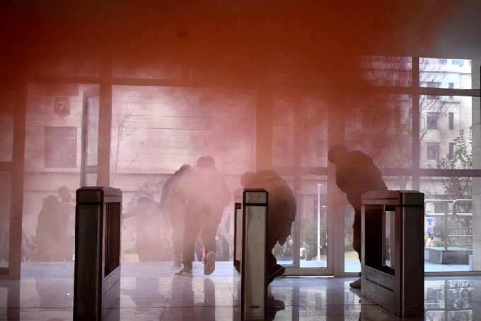 11月21日8时10分,山东财经大学燕山学院以2018级新生集中居住的5号、6号男生宿舍楼和7号、8号女生宿舍楼为现场,以楼内某处为模拟“火源点”,以全体新生为“逃生”对象,举行了2018级新生消防应急疏散逃生演练。