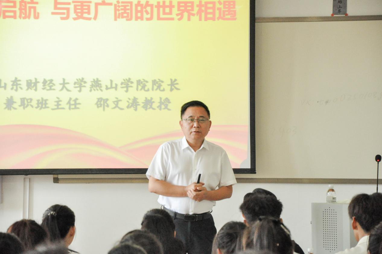 9月1日上午,山东财经大学燕山学院院长邵文涛作为航空服务艺术与管理专业2501、2502班的兼职班主任,为100名新生带来了一场别开生面的主题班会。