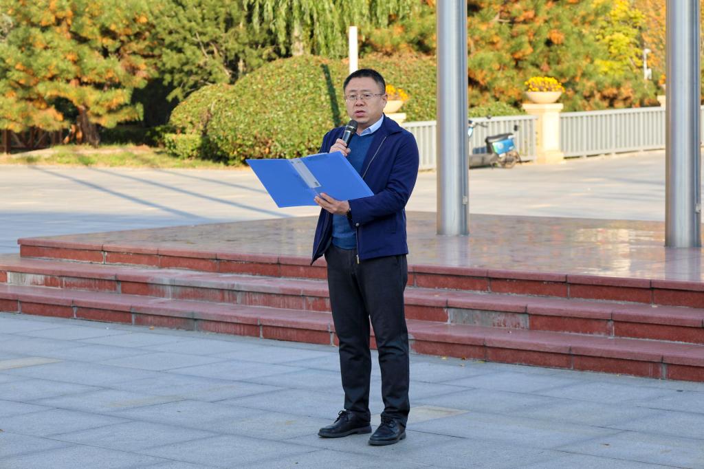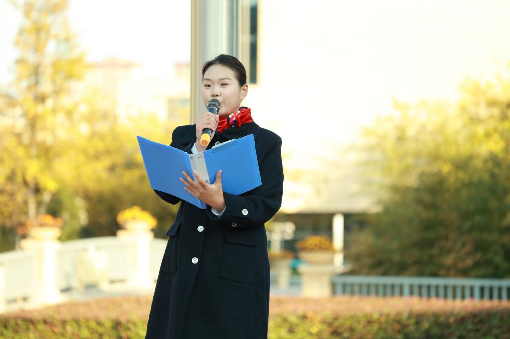 通识教育学院院长田金方在国旗下发表讲话。他充分肯定了航空服务艺术与管理专业学子入学两个月以来所展现的朝气与潜力,特别是在军训、文艺活动和全国啦啦操比赛中取得的优异成绩。围绕“蓝天之路,始于足下”的主题,田金方向同学们提出五点期望:一是以志向锚定航向,让蓝天梦想落地于每一堂课、每一次实训;二是以品格筑牢根基,锤炼责任意识,成长为德技并修的高素质航空人才;三是以担当回应时代,将个人理想融入航空强国建设的宏伟事业;四是以友谊点亮青春,在团队协作中凝聚未来飞行的合力;五是以信心奔赴未来,以踏实奋斗搭建通往蓝天的阶梯。