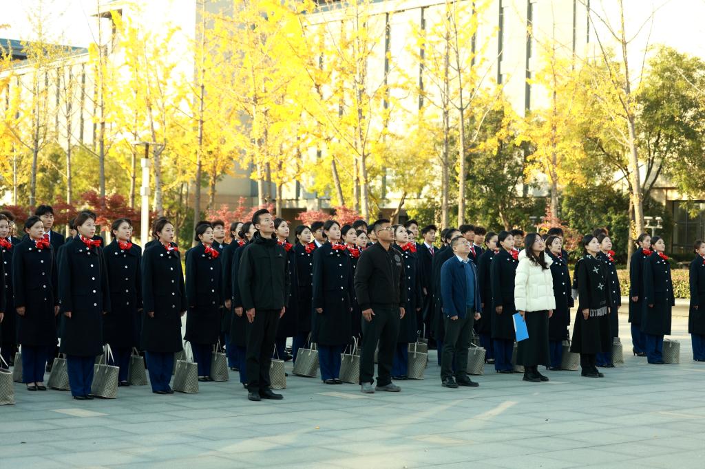 晨光初启,秋风飒爽。上午8时,仪式正式开始。通识教育学院院长田金方,专任教师郭桂一,辅导员李明明,航空服务艺术与管理专业教师王永伟、任唐百合,以及2025级航空服务艺术与管理专业全体学生共同参与。