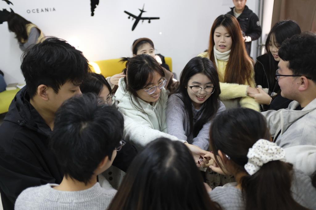 活动伊始,丁可珂老师以“心有千千结”游戏引导破冰。同学们牵手围圈、打乱队形后,在默契配合中逐步解开“人结”并恢复圆圈,现场欢声笑语不断,氛围迅速升温。